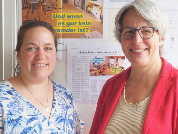Mareike Wiechers, Leiterin der Städtischen Kinderkrippe Eckernworth (links), zeigt Kerstin Claus, UBSKM (rechts), wie in Kitas der Schutz von Kindern vor sexueller Gewalt funktioniert. Juni 2023.